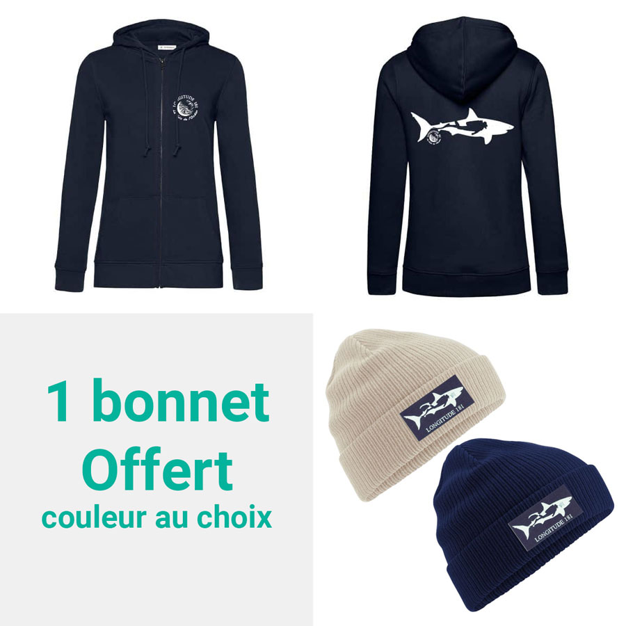 Lot Sweat zippé femme requin “Respect et Bienveillance” + Bonnet coton organique offert