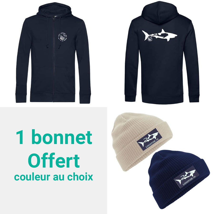 Lot Sweat zippé homme requin “Respect et Bienveillance” + Bonnet coton organique offert